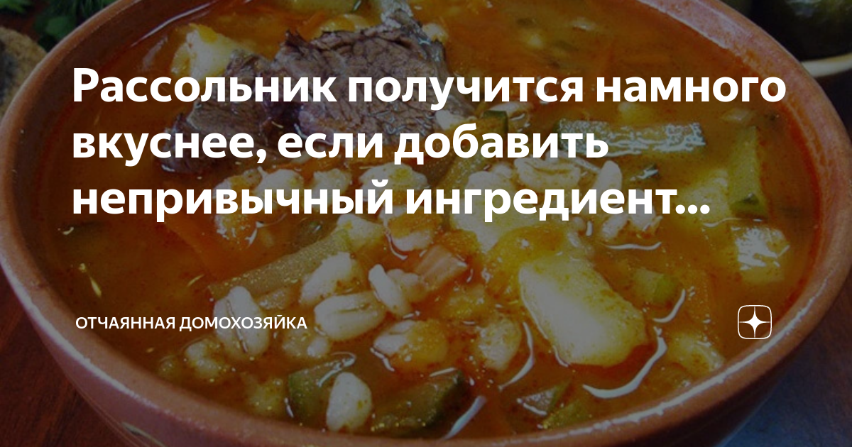 Отчаянная Домохозяйка Рассольник получится намного вкуснее, если добавить непривычный ингредиент Рассольник - один из самых вкусных и сытных супов. Сегодня поделюсь нюансами приготовления вкусного и наваристого рассольника. Некоторые не очень любят рассольник, из-за того, что в его составе имеется перловка. Если Вы относитесь к таким людям, то можно с легкостью заменить перловку на рис. Ингредиенты Говядина или…