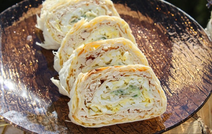 Рулет из лаваша с курицей, сыром и соленым огурчиком