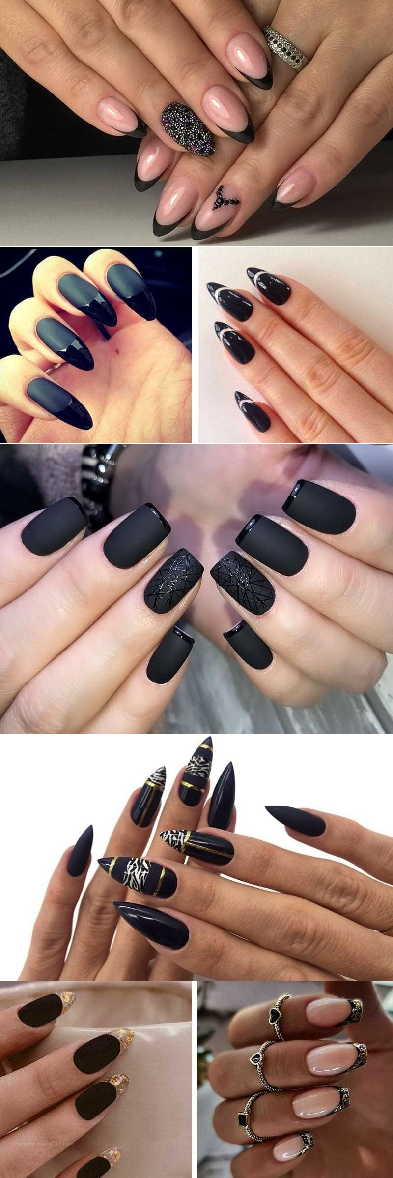 Чёрный френч на миндальной форме ногтей: дизайн, декор