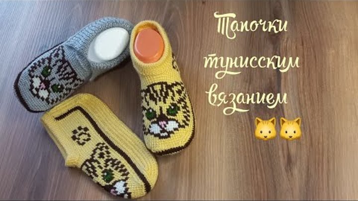 Вязаные тапочки "День кошек"🐱🐱. тунисское вязание+спицы 💛