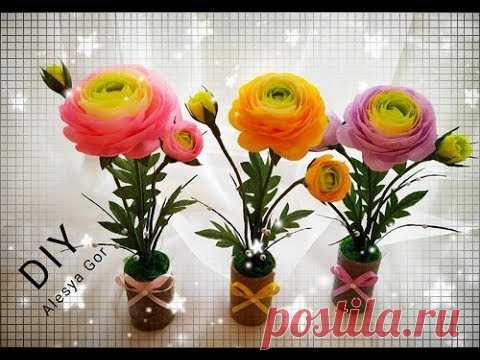 Ранункулюсы в вазе из джута, цветы из гофрированной бумаги DIY Ranunculus in a jute vase