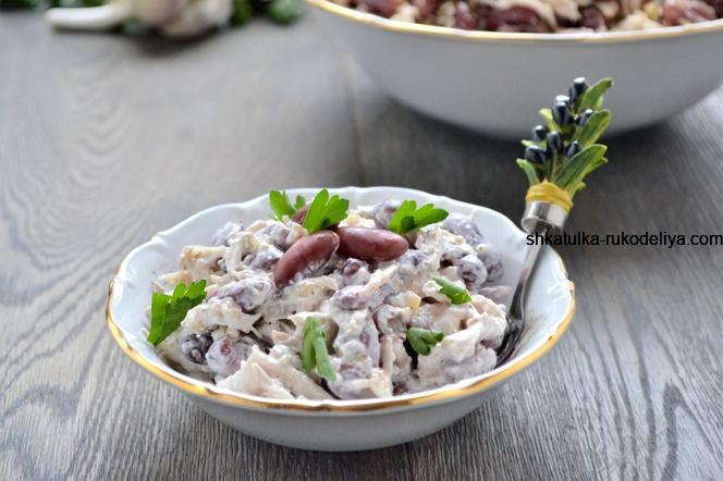 Цей рецепт сподобається любителям салатів. При тому що готується з недорогих і легкодоступних продуктів, цей салат сповнений смачних і ситних інгредієнтів, які чудово поєднуються один з одним. І гармонійно доповнює калейдоскоп смаків оксамитовий соус на основі грецького йогурту.ЗНАДОБИТЬСЯ:500 г курячої грудки5 шт. зварених круто яєць1 банка консервованої кукурудзи1 банка червоної квасолі в розсолі4 шт. маринованих