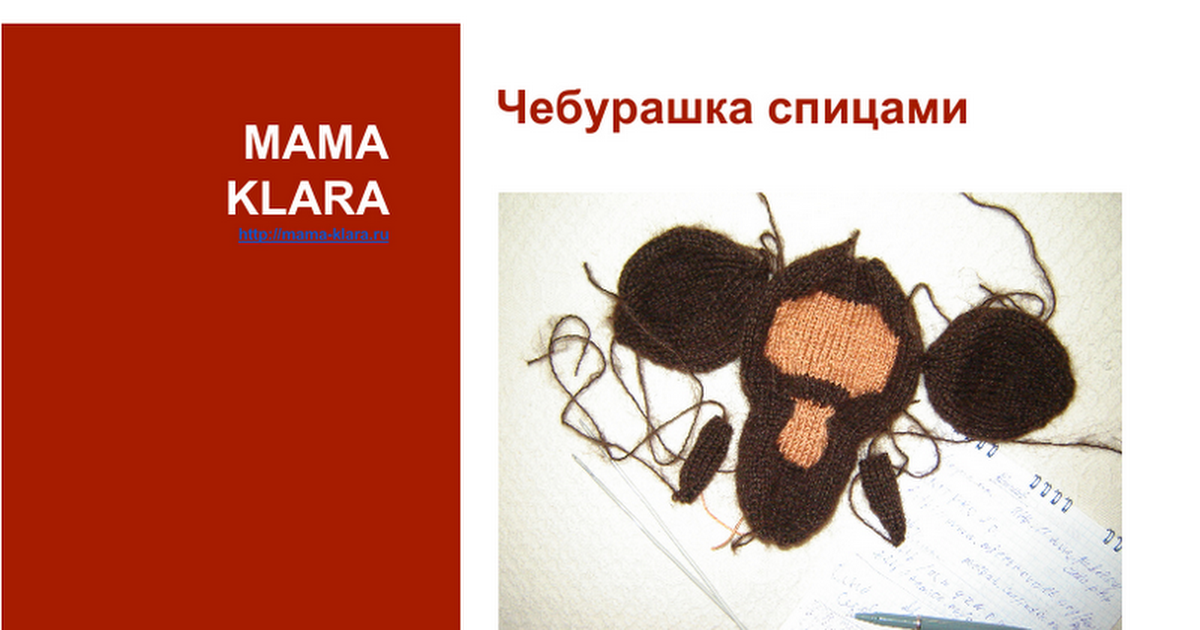 MAMA KLARA http://mama-klara.ru Чебурашка спицами Понадобится Мохер темно коричневого цвета около .50 гр.. Пряжа терракотового цвета немного, остаточки черной и белой пряжи ( не толстой) для глаз. Кусочек кожзаменителя коричневого или черного для пальчиков. - спицы №3; -...