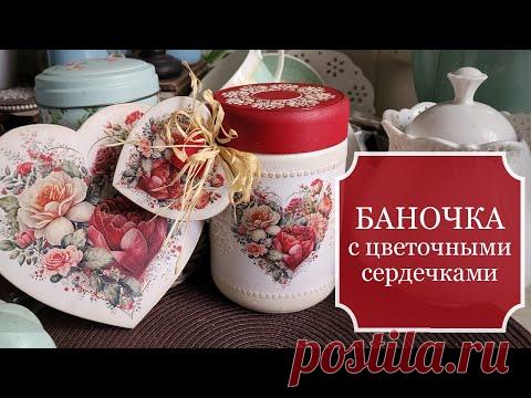 БАНОЧКА с цветочными СЕРДЕЧКАМИ - Как сделать Декупаж стеклянной банки своими руками - МК - СОВЕТЫ