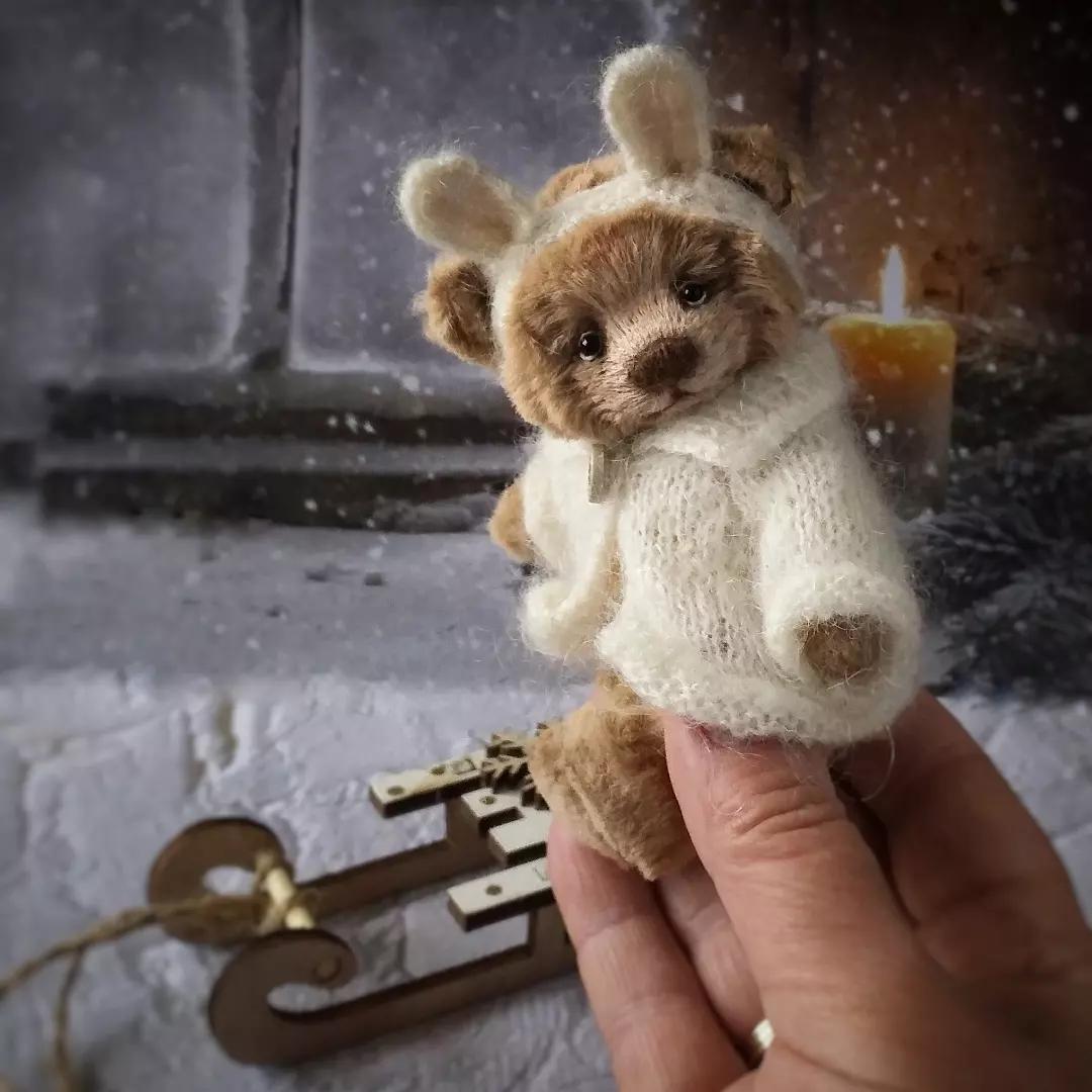 Мишка-Зайка выполнен из итальянской вискозы. Размер мишки 12 сантиметров. Мягко-тяжелая антистресс набивка, создает впечатление «живого» веса. Поэтому мишку очень приятно держать в руках. При изготовлении использованы высококачественные гипоаллергенные материалы. Шплинтовые крепления позволяют лапкам и голове свободно двигаться. Голова Мишки плотно наполнена опилками, туловище и лапки древесной шерстью, стеклянными и минеральными гранулами.
