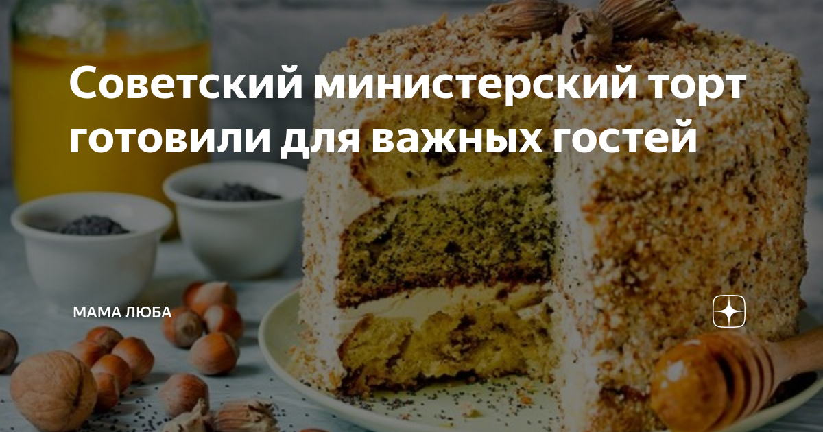 Советский министерский торт готовили для важных гостей Торт «Министерский» имеет три слоя, каждый которых мог бы стать самостоятельным вкусным десертом, но в этом необычном торте они собраны вместе и покрыты кремом из сгущенки. «Министерский» торт — это настоящий рай для сладкоежек! Рецепт этого торта имеет множество названий. Кто-то знает его как «Генеральский», кто-то — как «Королевский», а кто-то даже знает его под романтическим названием «Дамский каприз». Аутентичный р...