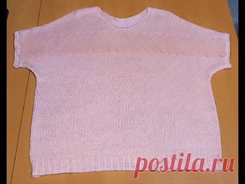 Летний джемпер спицами со спущенным рукавом с кружевной вставкой, МК