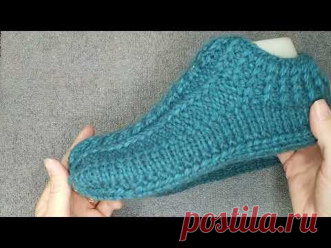 Домашние тапочки на двух спицах без единого шва!! ( шов без иглы и крючка)