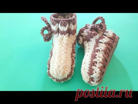 Детские тапочки-ботиночки спицами без шва по подошве | Длина подошвы 15 см. Авторская работа.
