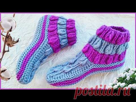 Домашние следки спицами. УЗОР "Объёмные листики на резинке".Простые тапочки без швов на подошве.