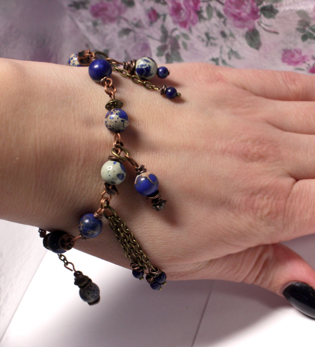 Браслет выполнен из синей яшмы (ирнимита), лазурита и металлической фурнитуры.
