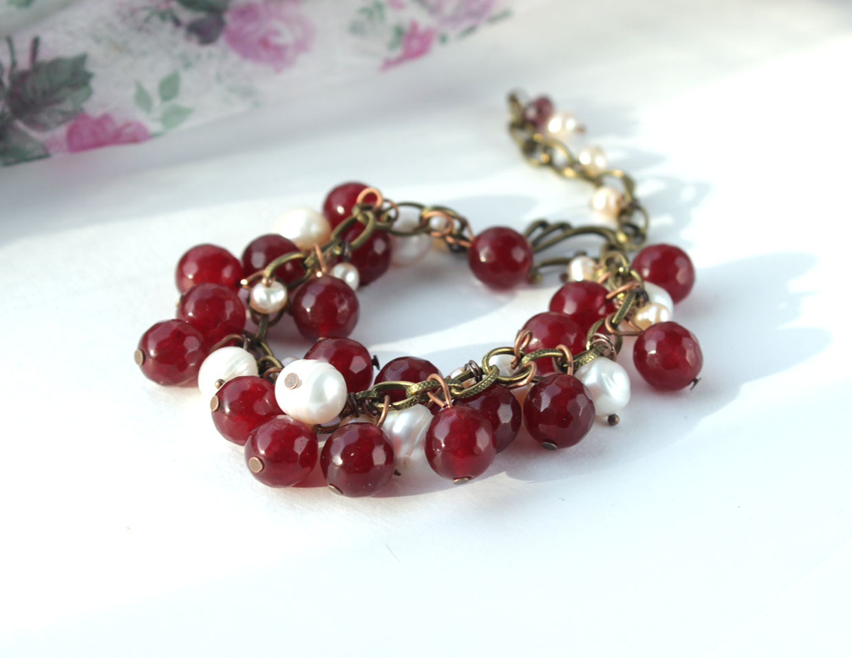 Роскошный браслет из агата и жемчуга. Камни натуральные. Агат гранёный, затонирован в бордовый цвет. Бордовый браслет на цепочке. В качестве застёжки использован замок-крючок, он удобен в использовании, можно легко надеть браслет без посторонней помощи. Минимальный размер браслета 17 см, а крупная цепочка позволяет использовать браслет практически на любой обхват руки. _____ БЕСПЛАТНАЯ ДОСТАВКА ПОЧТОЙ ПО РФ! _____ Размер: 17 см + удлиняющая цепочка