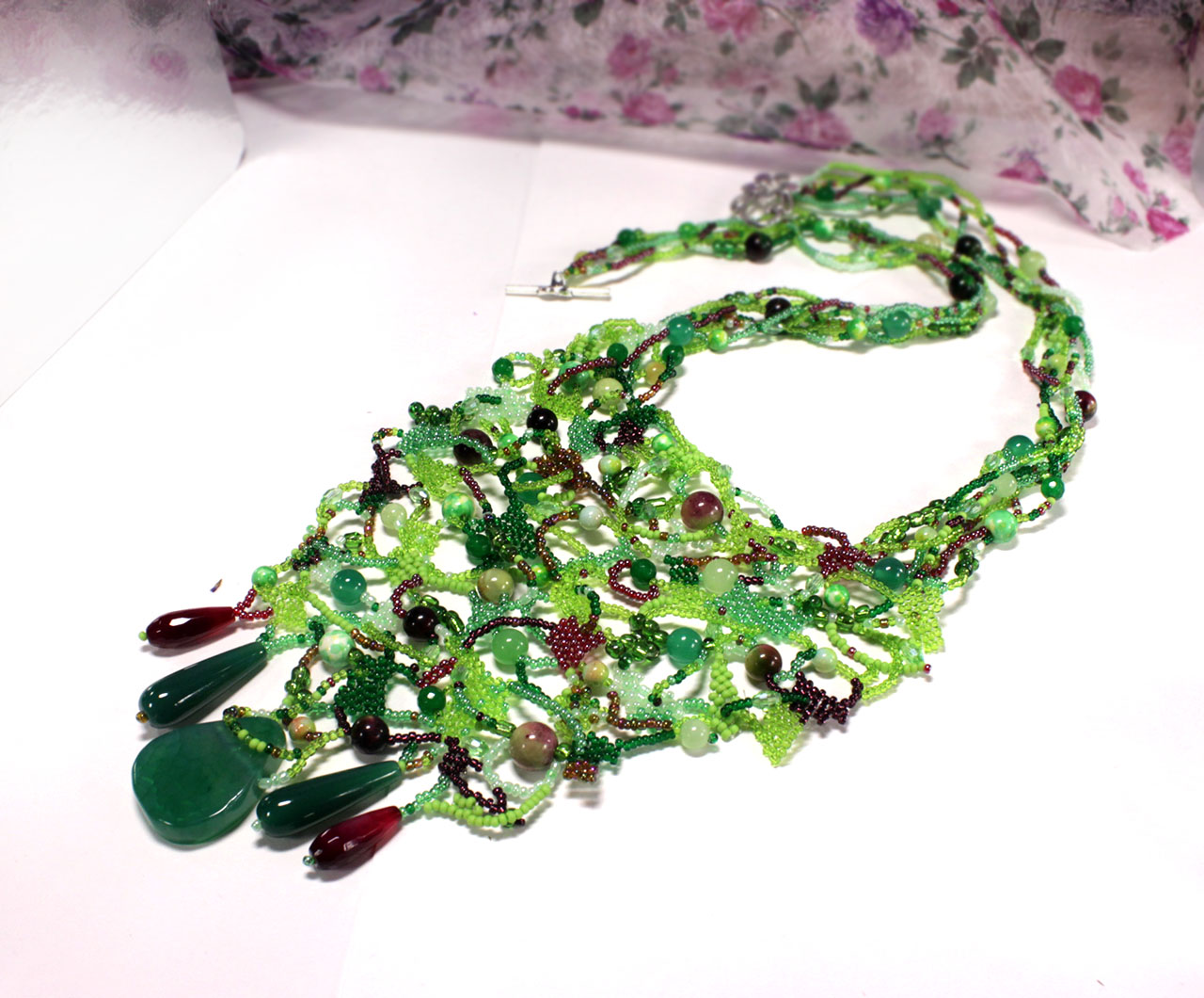 Украшение из чешского бисера разных оттенков зелёного и бордового цветов, а также из натуральных камней - агата тонированного, оникса, нефрита.