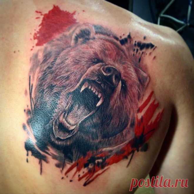 Медведь олицетворяет у людей силу, ярость, уверенность в себе. Такой символизм особенно популярен у мужчин. Большие изображения медведя требуют большей площади для нанесения, поэтому самыми популярными частями тела для медведя являются грудь и плечи, позволяющие получить объёмные и эффектные изображения. Медведей накалывают улыбающимися, в ярости, в силуэте, используя акварельный стиль, рисуют портреты, изображают морды, только лапы или целое животное, в абстракте или в цвете, в сочетании с другими деталями и самостоятельным персонажем.