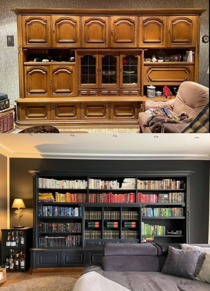 Обновление старой мебельной стенки: большинство дверец сняли, ошкурили, зашпаклевали оставшееся и всё окрасили. Ну не узнать!