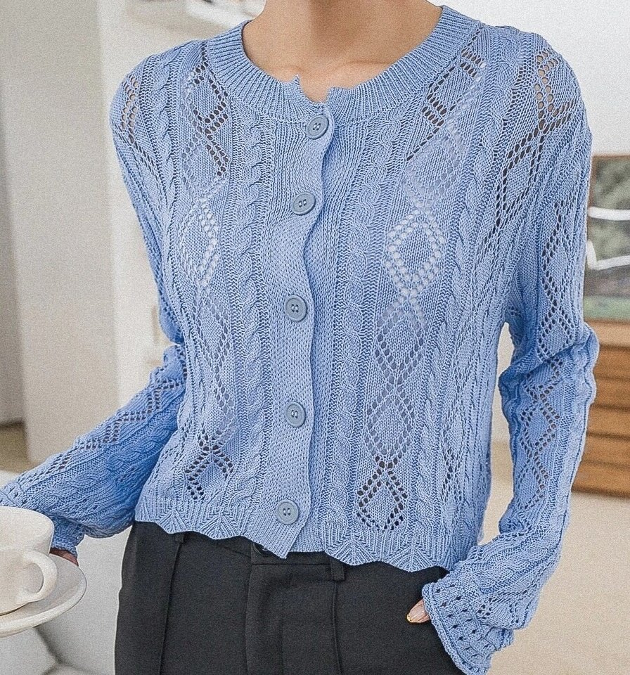 Очаровательная ажурная кофточка на пуговицах в приятном небесно-голубом оттенке.