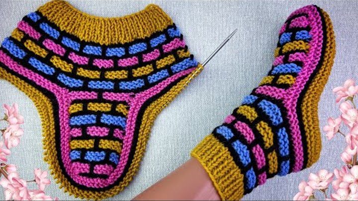 ЯРКИЕ НОСОЧКИ-СЛЕДКИ СПИЦАМИ ИЗ ОСТАТКОВ ПРЯЖИ.
