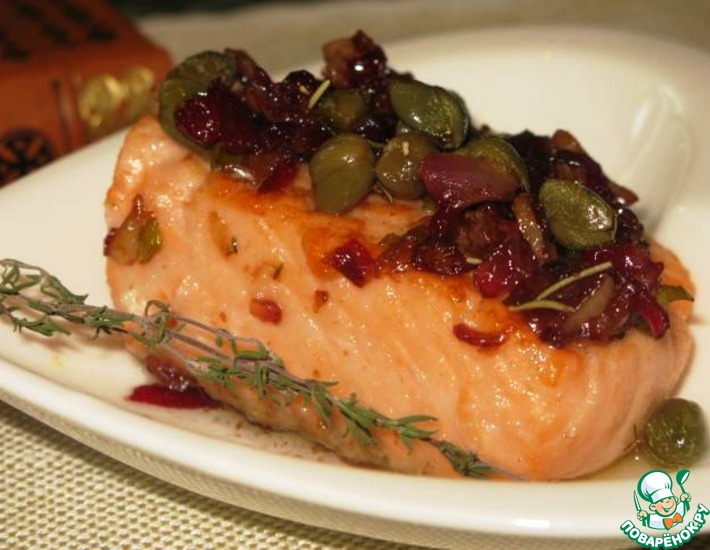 - Филе рыбы помыть и нарезать на небольшие куски. Можно брать любую рыбу (треска, минтай и т. д.). Я взяла красную, хотя она и без маринада вкусная. Но так получилось, что оказалось у меня очень много дешёвой красной рыбы. Обвалять рыбу в подсоленной муке, излишки муки стряхнуть. В сковороде разогреваем 2 ст. л. масла и обжариваем рыбу на небольшом огне по 5 минут с каждой стороны. Выкладываем рыбу в глубокую посуду. Теперь делаем маринад. Лук и чеснок мелко нарезаем. В сковороду, где жарили рыбу, добавляем оставшееся масло, лук и чеснок. Обжариваем в течение 7 минут. Добавляем нарезанный зелёный лук, тимьян, розмарин, чёрный перец. Жарим 3-5 минут. Добавляем цедру, апельсиновый сок. Добавляем вино, уксус. Добавляем каперсы. И сахар. Я взяла сахар ТМ "Мистраль". Доводим до кипения и заливаем рыбу. После того, как рыба остынет, ставим её на ночь в холодильник. Подаём или как закуску (при комнатной температуре), или разогрев в микроволновой печи, как горячее блюдо. Подаём к столу. Вот такой аппетитный кусочек. ...