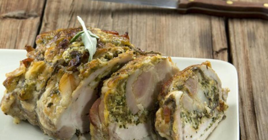 - 1. Замачиваем грибы в холодной воде на 3-4 часа, затем промываем. Процеживаем оставшуюся после замачивания воду. Отвариваем грибы в воде, в которой они замачивались, до готовности. Затем обсушиваем и нарезаем тонкой соломкой. Измельчаем зелень петрушки. Натираем сыр на крупной терке. Соединяем грибы, зелень и сыр, добавляем рубленые орехи и чеснок, измельченные ягоды, молотый перец и перемешиваем до однородности. 2. Нарезаем мякоть свинины пластами толщиной не более 1 см, не прорезая кусок до конца. Режем грудинку тонкими ломтиками и выкладываем между пластами мяса. Выкладываем на кусочки грудинки грибную начинку. 3. Прижимаем пласты друг к другу. Солим и перчим сверху мясо по вкусу. Перевязываем мясо нитью. 4. Запекаем мясо в разогретой до 270 градусов духовке. Затем уменьшаем нагрев до 170 градусов и доводим до готовности. Приятного аппетита!