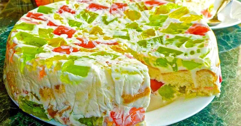 Простой рецепт: торт «Битое стекло» со сметаной и желе Торт «Битое стекло» — это популярный и эффектный десерт, очень простой в приготовлении. Справится даже ребенок, ведь не нужно возиться с тестом, сложным кремом и даже включать духовку. Хозяйке с любым кулинарным опытом по зубам такое красивое угощение.
