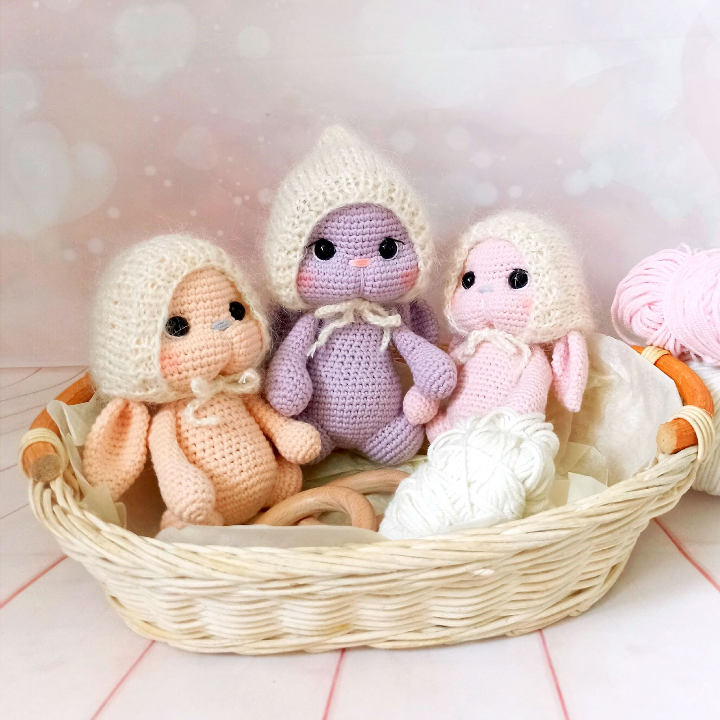 PDF Зайка-попрыгайка крючком. FREE crochet pattern; Аmigurumi toy patterns. Амигуруми схемы и описания на русском. Вязаные игрушки и поделки своими руками #amimore - маленький зайка в чепчике, заяц, зайчик, кролик, зайчонок, крольчонок.