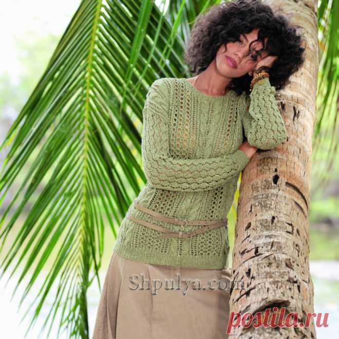 Женственный удлиненный пуловер связан спицами сочетанием «кос» и ажура из хлопка с шерстью цвета хаки.