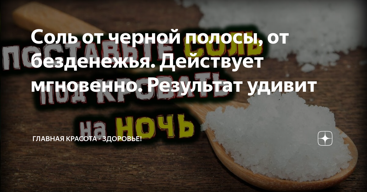 Соль от черной полосы, от безденежья. Действует мгновенно. Результат удивит Все мы знаем, что без соли жить нельзя. Этот продукт незаменим в кулинарии. Соль - чудесный дар нашей матушки природы. В ней сосредоточена энергия земли.