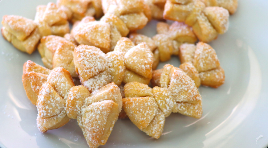- Получившиеся кружочки обвалять в оставшемся сахаре. Надрезать их, как показано в видео, и сформировать 'бантики'. Выложить на противень, выстланный пергаментом. Выпекать печенье 25 минут при 180 градусов