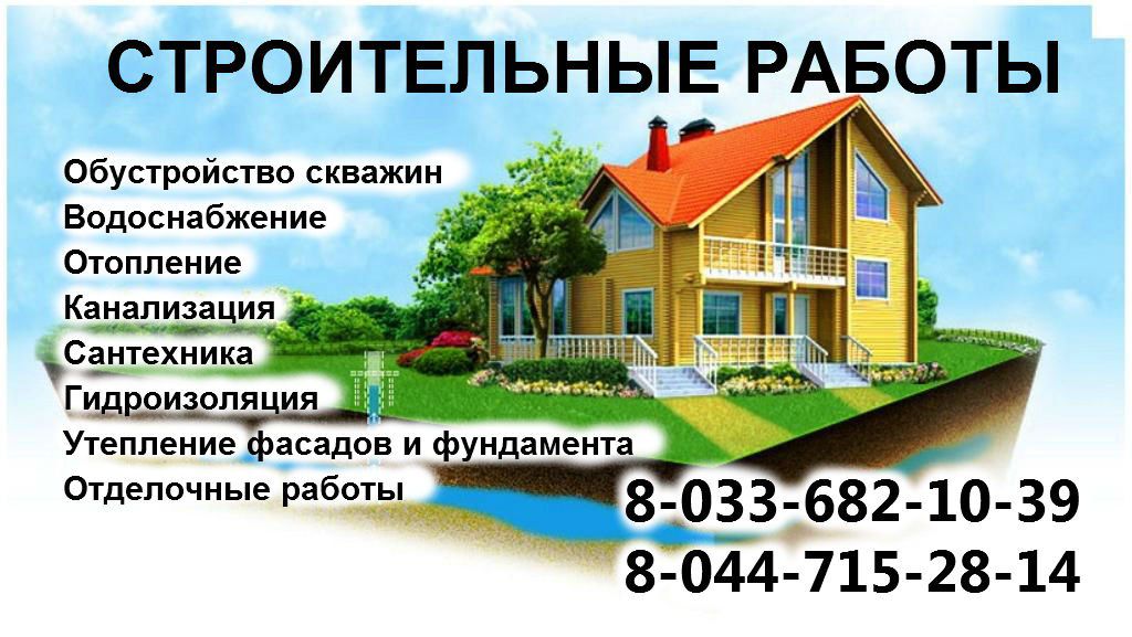 БУРЕНИЕ ВОДОЗАБОРНЫХ СКВАЖИН . СТРОИТЕЛЬСТВО ГРАЖДАНСКИХ И ПРОМЫШЛЕННЫХ ОБЪЕКТОВ . УТЕПЛЕНИЕ ФАСАДОВ И ФУНДАМЕНТА . ГИДРОИЗОЛЯЦИЯ . ОТДЕЛОЧНЫЕ РАБОТЫ ОФИСОВ И ДОМОВ . СИСТЕМЫ КАНАЛИЗАЦИИ ВОДОСНАБЖЕНИЯ ОТОПЛЕНИЯ . И МНОГОЕ ДРУГОЕ .