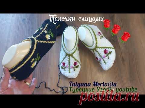 Тапочки спицами с цветочным узором🌹🌹🌹 краткое описание.