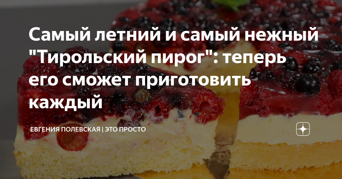 Самый летний и самый нежный "Тирольский пирог": теперь его сможет приготовить каждый Статья автора «Евгения Полевская | Это просто» в Дзене ✍: Сегодня я к вам с самым летним и самым нежным пирогом. Я уверена, что все его знают – это «Тирольский пирог».