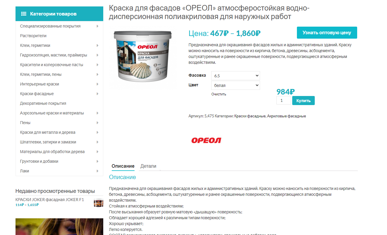 Купить Краска для фасадов «ОРЕОЛ» атмосферостойкая водно-дисперсионная полиакриловая для наружных работ в Симферополе с доставкой по Крыму
