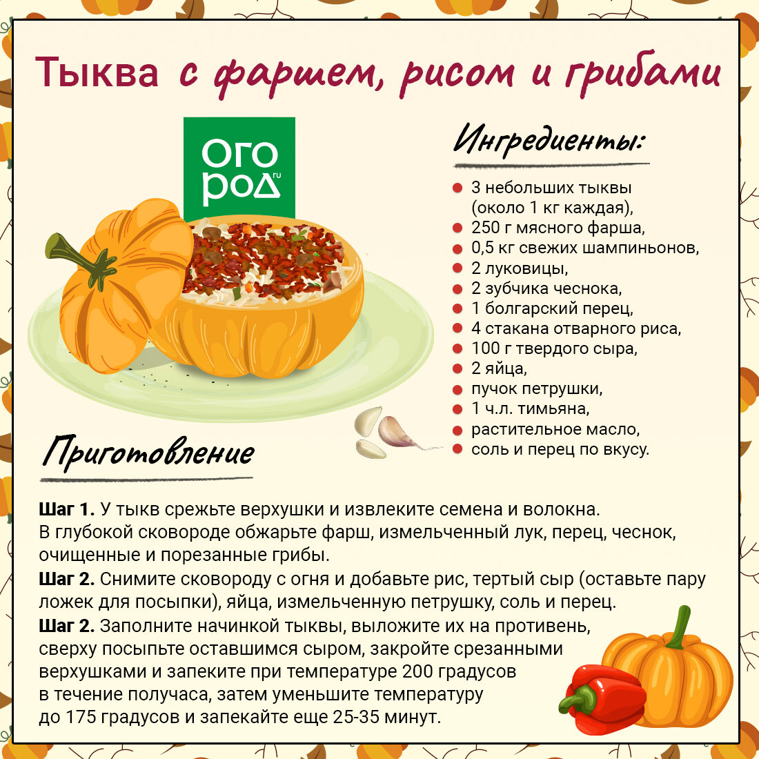 Тыква с фаршем, рисом и грибами
