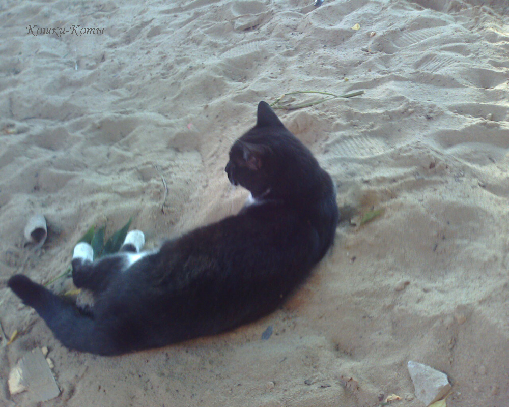 На морском песочке. Ну не на морском, допустим. Неважно. Здесь тоже песок хорош, чтобы полежать на нём, позагорать. А то окрас неравномерный. Спина черная, сам весь черный, а лапы белые. Вот не надо было лапы в песок зарывать. На виду их надо держать, к солнышку поближе. 🐈 Кошки каждый день: 12 июля