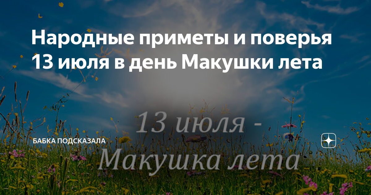 Народные приметы и поверья 13 июля в день Макушки лета Статья автора «Бабка подсказала» в Дзене ✍: Народные приметы и поверья 13 июля в день Макушки лета, что не стоит делать в этот день июля. Какой праздник принято отмечать 13 июля.