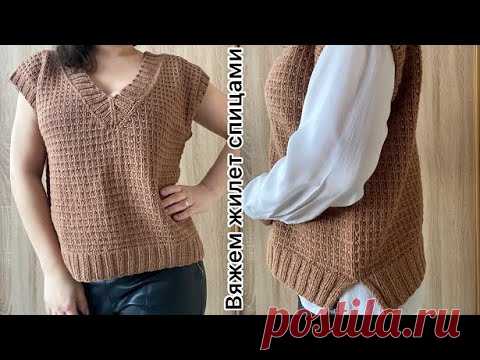 Мастер класс жилет спицами простым узором с V-образным вырезом и разрезами по бокам!
