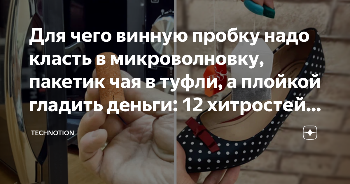 Для чего винную пробку надо класть в микроволновку, пакетик чая в туфли, а плойкой гладить деньги: 12 хитростей умных хозяек Статья автора «TECHNOTION» в Дзене ✍: На неделе мы с коллегами собирались в неформальной обстановке. Делились своими переживаниями о работе и не только.