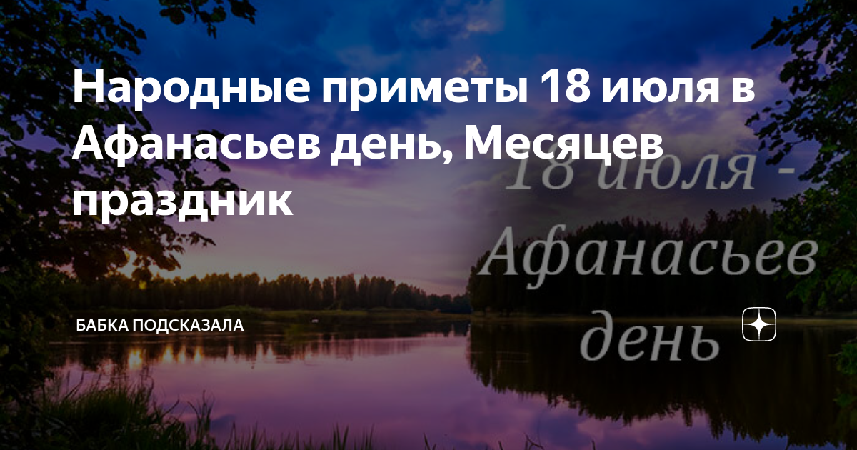 Народные приметы 18 июля в Афанасьев день, Месяцев праздник Статья автора «Бабка подсказала» в Дзене ✍: Народные приметы 18 июля в Афанасьев день, Месяцев праздник. Что не стоит делать в этот июльский день по поверьям и приметам.