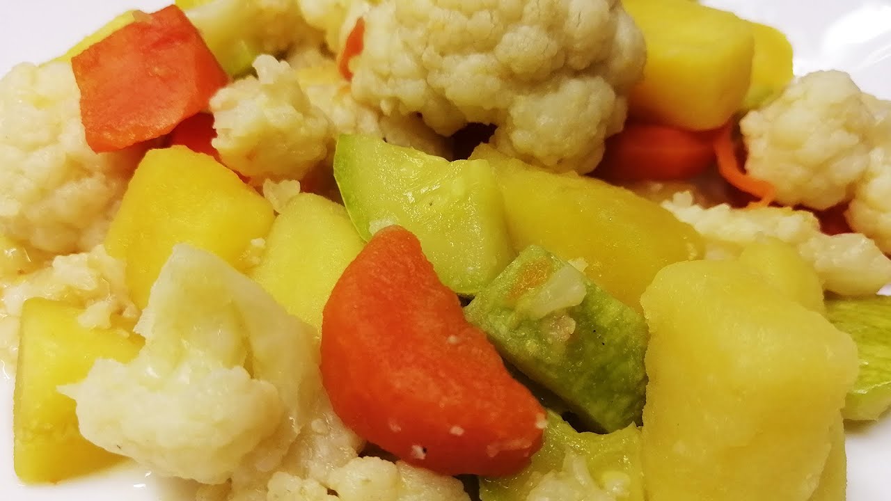 ОВОЩНОЕ РАГУ из картофеля, моркови, кабачка и цветной капусты ИНГРЕДИЕНТЫ1. Цветная капуста – 200 г2. Картофель – 200 г3. Морковь – 200 г4. Кабачок – 200 г5. Соль по вкусу