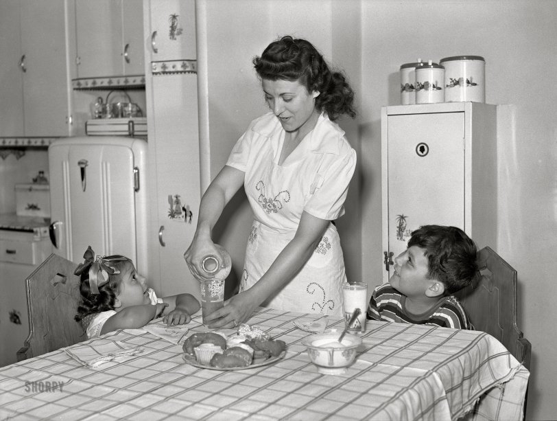 Drink Up: 1942 June 1942. "Brooklyn, New York. Red Hook housing development. Mrs. James Caputo in the modern kitchen of her apartment, pouring milk for Annette and Jimmy. The children drink more than a quart apiece daily." Acetate negative by Arthur Rothstein.