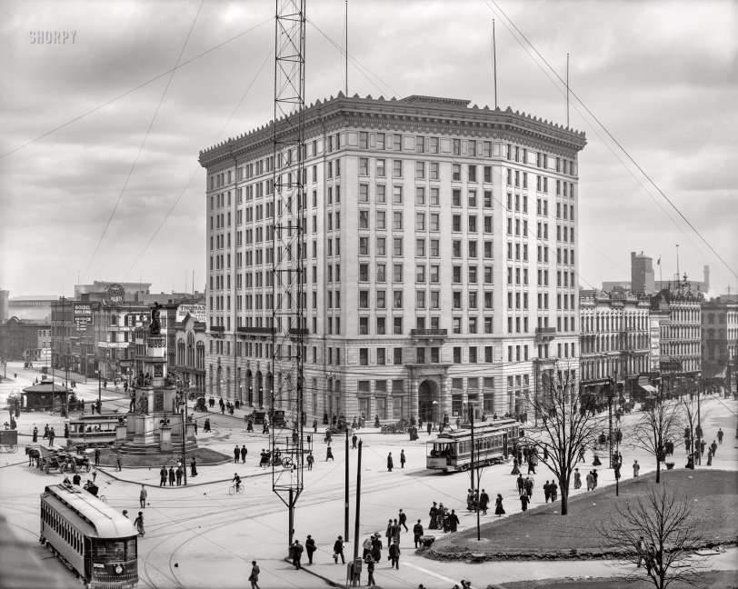 Detroit Landmarks: 1908 Detroit, 1908. "Cadillac Square, Soldiers' and Sailors' Monument and Hotel Pontchartrain from City Hall." Also the lower section of one of the city's famous "moonlight tower" arc lamps. And: Someone stop that hat! 8x10 inch glass negative, Detroit Publishing Company.