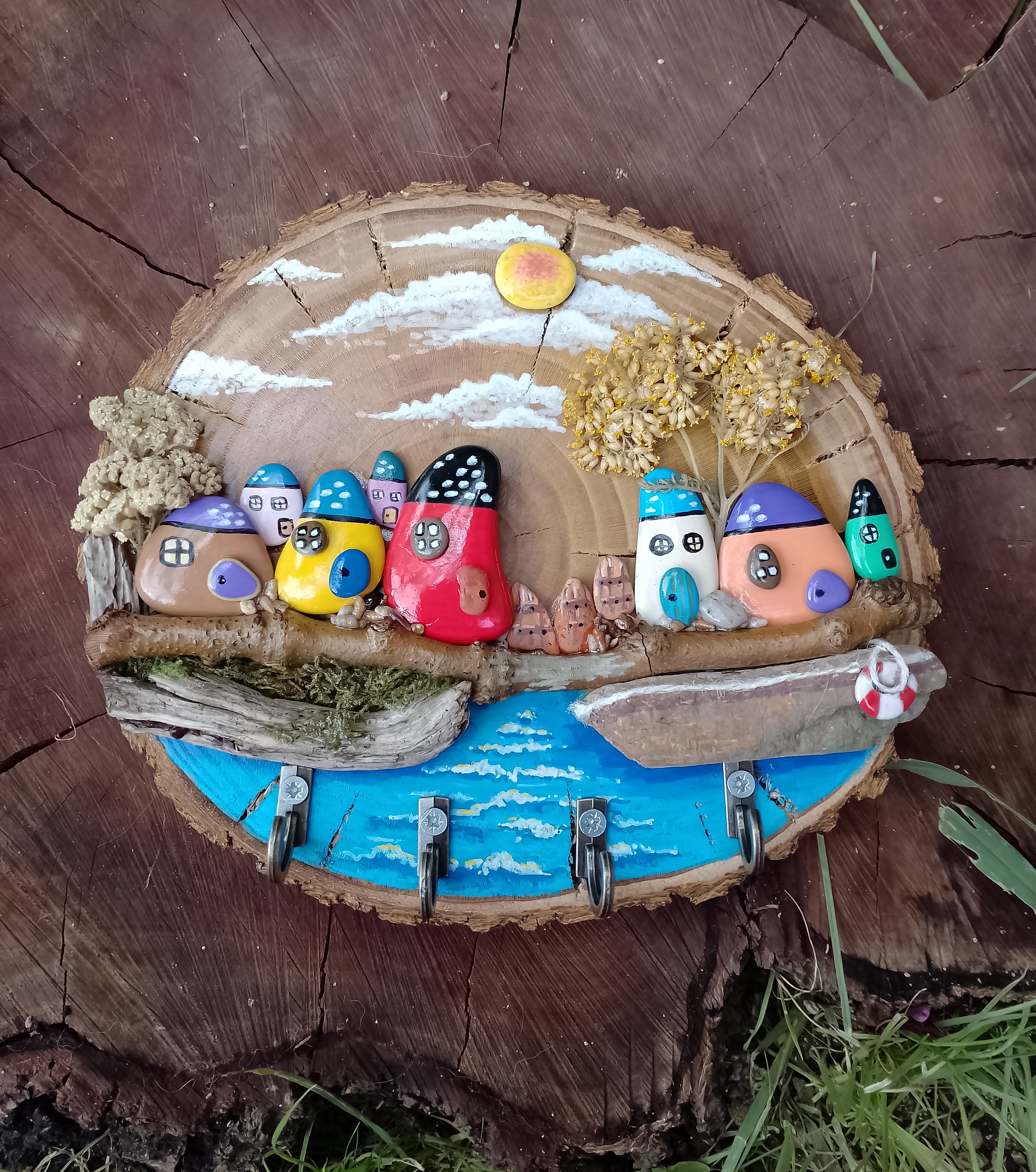 Ключница для вашего дома или подарок на любой случай жизни. Ключница выполнена из природных материалов. Галька собранная на берегу Чёрного моря, кусочки дерева пропитанные морской волной, спил дерева с корой. Галька расписана акрилом. Изделие покрыто лаком. Металлические крючки
