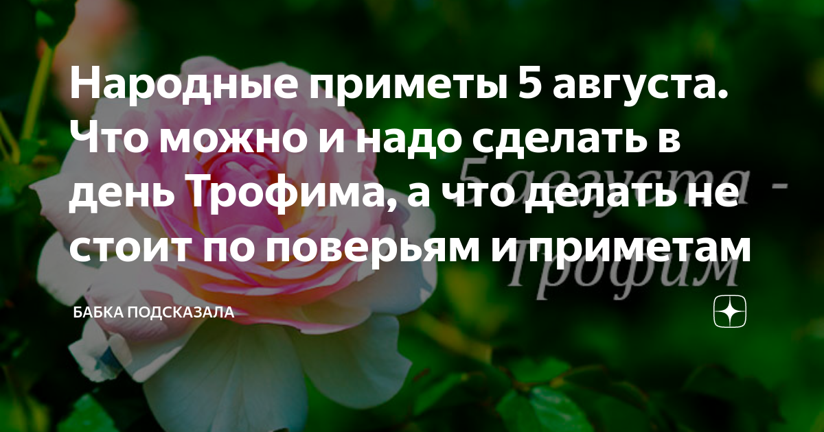 Народные приметы 5 августа. Что можно и надо сделать в день Трофима, а что делать не стоит по поверьям и приметам Статья автора «Бабка подсказала» в Дзене ✍: Народные приметы 5 августа. Что можно и надо сделать в день Трофима, а что делать не стоит по поверьям и приметам. Какой праздник принято отмечать 5 августа.