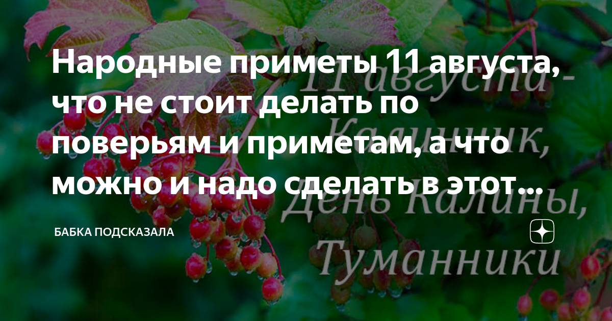 Народные приметы 11 августа, что не стоит делать по поверьям и приметам, а что можно и надо сделать в этот день августа Статья автора «Бабка подсказала» в Дзене ✍: Народные приметы 11 августа, что не стоит делать по поверьям и приметам, а что можно и надо сделать в этот день августа.
