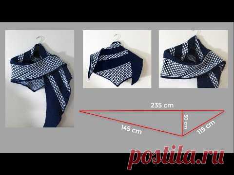 Асимметричная треугольная шаль с мозаичными вставками. Вязание спицами.