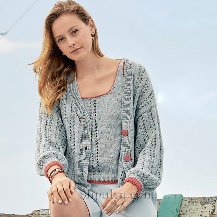 Летний вязаный комплект из кардигана с большими пуговицами и топа выполнен ажурными полосами и украшен контрастной каймой.