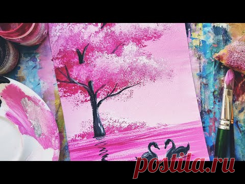 РОЗОВЫЙ ПРУД |Картинка-влюблинка💗 Ооооооочень просто гуашью! Рисунок для начинающих