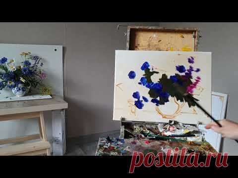 Как добиться яркости красок? Этюд с васильками и ромашками.