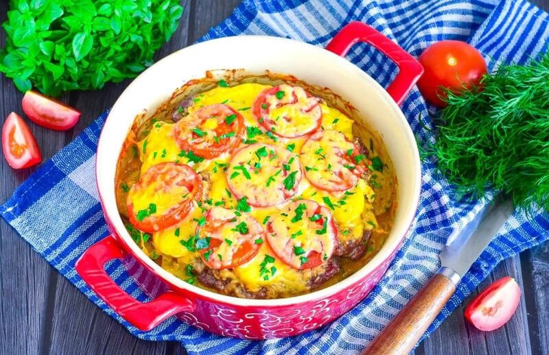 Говядина С Картошкой Помидорами И Сыром В Духовке Говядина с картошкой помидорами и сыром в духовке - мясо и гарнир запекаются вместе, что существенно экономит время на готовку.