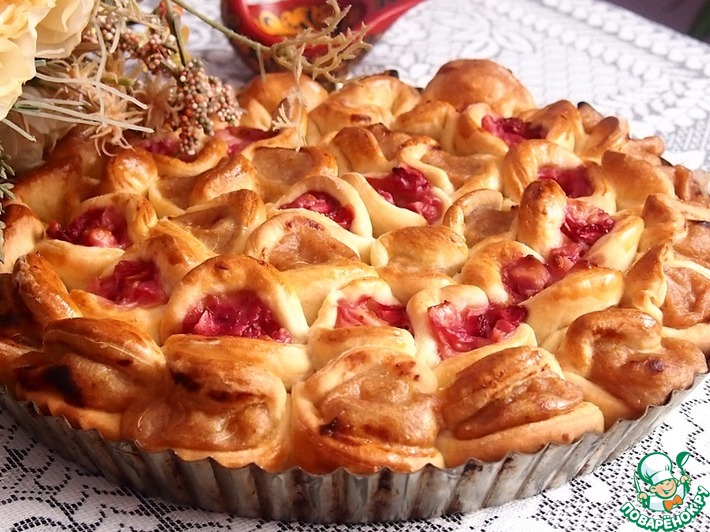 - Просеянную через сито муку смешать с сухими дрожжами, сахаром и щепоткой соли. Добавить 2 яйца, растопленное и охлажденное масло и теплое молоко. Замесить тесто, накрыть его полотенцем и оставить для подъема примерно на час. Пока тесто поднимается, приготовим начинки. Итак, ревень чистим и нарезаем на кусочки. Складываем кусочки ревеня в кастрюлю, добавляем сначала две ложки сахара и тушим до образования однородной массы, добавляем сахар по вкусу, у меня всего ушло примерно 5 столовых ложек. Выключаем огонь и всыпаем в ревенекую "кашу" горсть мелко порубленных орехов. В случае, если начинка все еще будет жидковата, то добавьте еще орехов или загустите ее ложкой панировочных сухарей или толченого печенья, или половиной пачки ванильного пудинга. Можно просто добавить ложку крахмала. Начинку остудить. Для второй начинки в ковшике смешать сахар с половиной пачки клубничного пудинга, добавить 200 мл молока, размешать. Поствить на огонь и, помешивая, варить до загустения. Выключить огонь и вмешать в пудинг гость мелко нарезанной клубники. Чтобы при остывании пудинга не образовалась пленка и для ускорения процесса, пудинг накройте пищевой пленкой, положив ее прямо на поверхность, а ковшик поставьте в миску с холодной водой. Тесто увеличилось в объеме в два раза. Раскатываем его в пласт и стаканом или формой диаметром 6-7 см вырезаем кружочки. На каждый кружок выкладываем примерно чайную ложку ревеневой начинки. Перегибаем кружок теста пополам и пальчиками придавливаем тесто по краям, оставляя верхнюю часть открытой. Края слепить между собой, получается как бы пельмешек с открытым верхом. Форму для пирога застелить бумагой для выпечки, смазать бумагу маслом. Укладывать наши "пельмешки" (или розочки, как кому больше нравится) по кругу, не очень плотно. То же самое проделываем с другой начинкой и укладываем розочки вторым кругом. Продолжаем выкладывать детали нашего пирога, чередуя круги с разными начинками. Оставляем пирог немного подойти, смазываем яйцом и выпекаем в разогретой духовке при температуре 180 градусов 30-35 минут. Нужно сказать, что этот пирог расчитан на большую форму. Моя форма 25 см, поэтому у меня осталось тесто, и я испекла еще один пирожок. В принципе, этот пирог можно печь и таким образом, если нет времени возится с розочками. Тесто раскатать, уложить в форму. Выложить ревеневую начинку. Сверху пудинг. Украсить полосками теста, смазать яйцом и выпекать 30 минут при температуре 180 градусов. Честно говоря, не знаю, какой из этих двух пирогов вкуснее. Первый, безусловно, интереснее и красивее, а второй попроще, но в нем больще начинки, чем теста. Готовый пирог можно, по желанию, посыпать сахарной пудрой. Вот вид поближе. Пирог можно есть, разрезая его на куски, А можно лакомиться, разбирая его на отдельные булочки-розочки. Приятного аппетита!